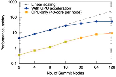 The plot above shows the strong scaling performance of our GPU codes is close to linear and is consistently faster than the version without GPU by a factor of 3 up to 128 nodes on a world-class supercomputer.