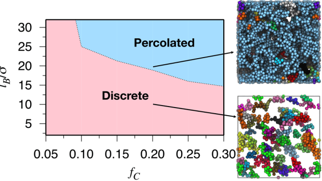 The figure above shows different nanostructures predicted by our Molecular Dynamics simulations that may form depending on the charge fraction of the polymers (fC) and the strength of their electrostatic interaction (lB). The percolated nanostructure is of particular interest in engineering solid electrolyte batteries. ML techniques including classification, neural networks and language-inspired models of polymers are employed for predicting new structures without running simulations.